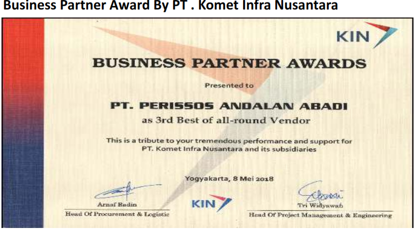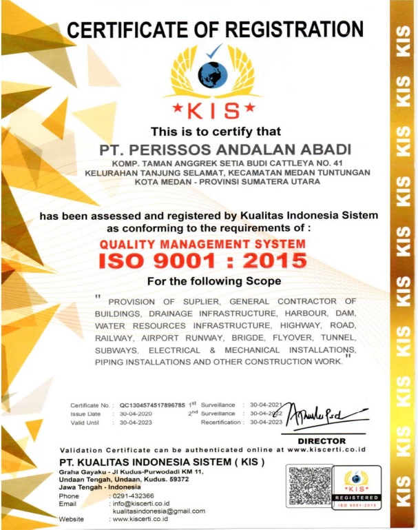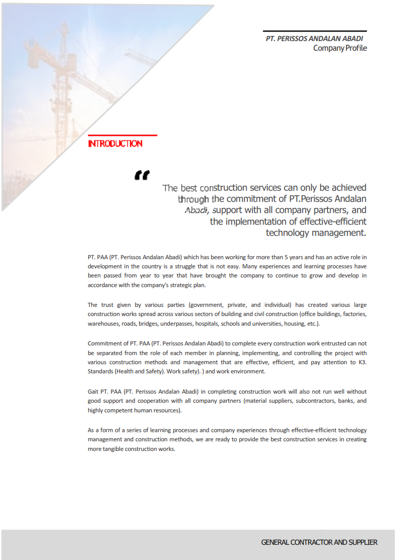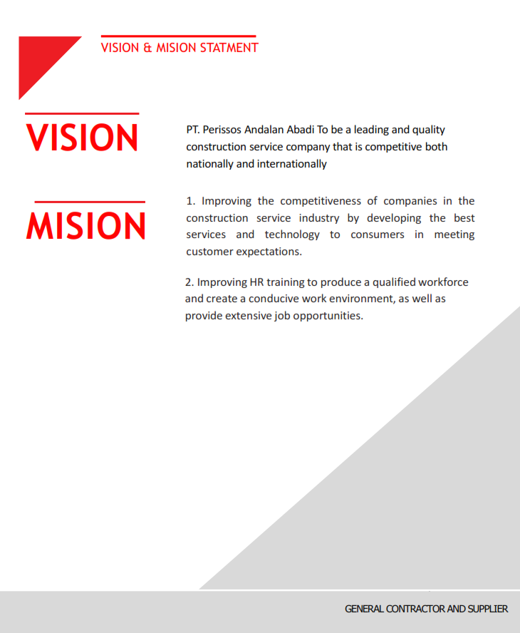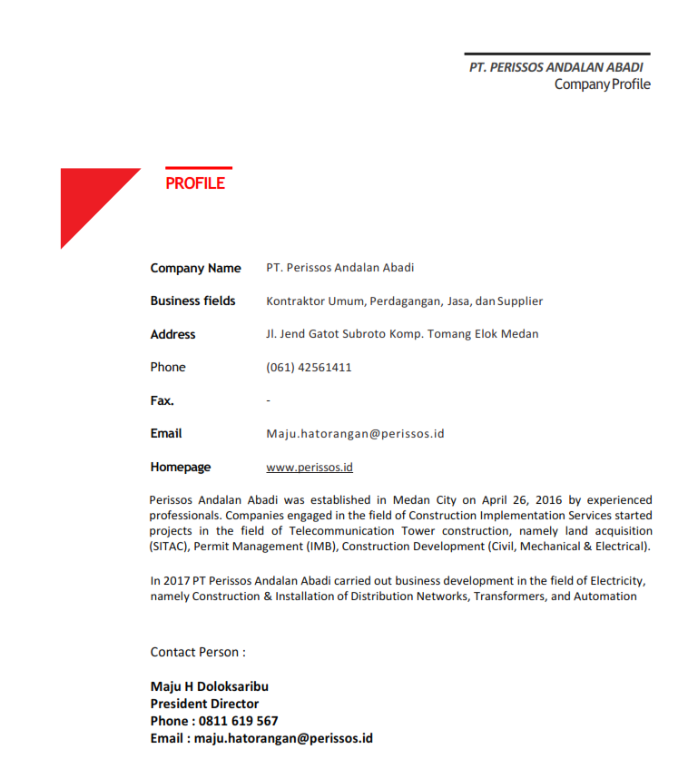 Company profileSince 2016, Perissos Andalan Abadi has become one of the general contractors in Indonesia. Encouraged by the untapped potential of the local market opportunity, the decision to pursue an aggressive expansion strategy was made. To fully unleash the potential of Indonesia's construction market, we constantly assemble a qualified and committed team led by strong management. With a particular focus on delivering exceptional and timely services, we have solidified our reputation as the go to source for handling various civil mechanical and electrical construction related projects, with emphasis in the field of telecomunication and industries facilities construction.